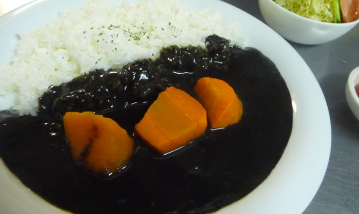 口に入れた瞬間!フルーティーな甘さが広がり、あとから追いかけて来るように、スパイシーな辛さが交わって一度口にするとクセになる絶妙な味をかもし出す、追いかけっこする甘さと辛さが特徴で、体に優しい『竹炭粉』を使用する事で、製造後一週間冷蔵保存して深い味わいをかもし出す、まっ黒いカレーです。